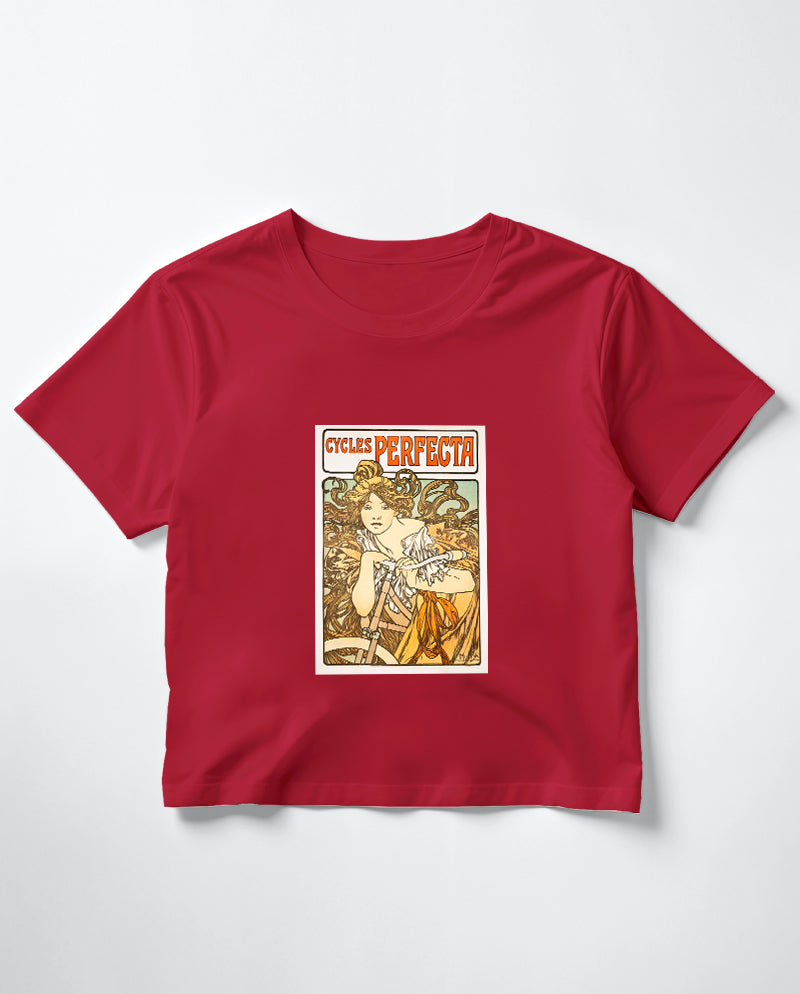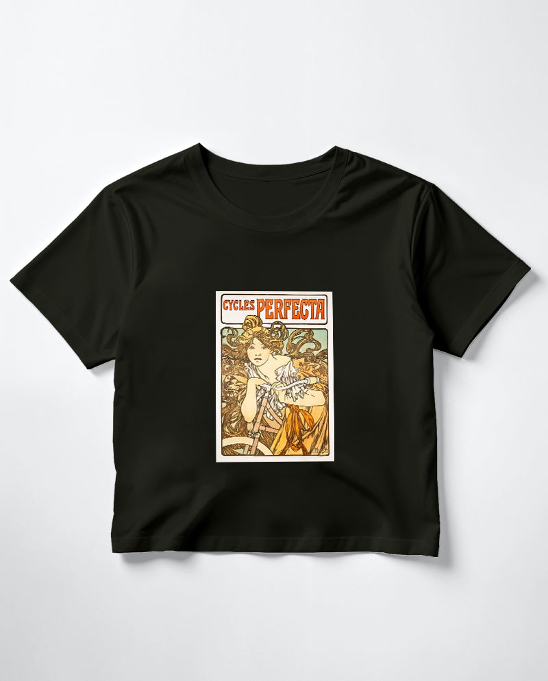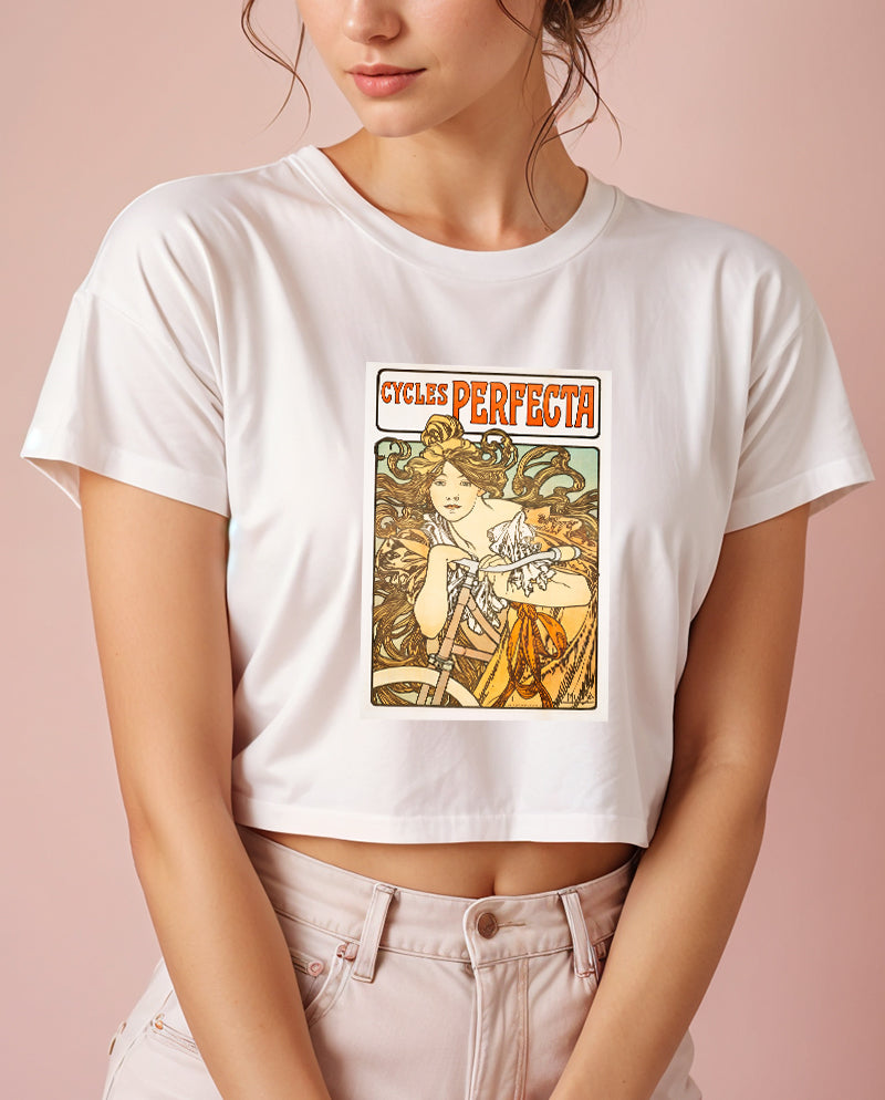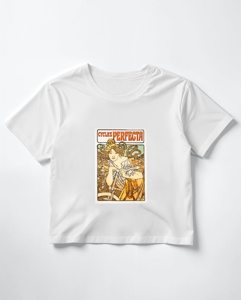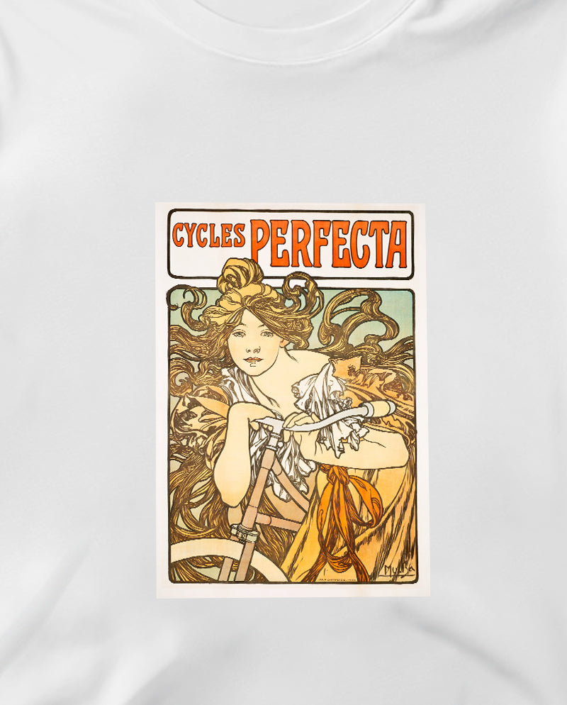 Alphonse Mucha, İngiliz Cycles Perfecta firması için hazırladığı bu afişte, bisiklete binmenin getirdiği özgürlük ve heyecanı ifade ediyor. Kadın figürlerinin ayırt edici özelliklerinden biri olan stilize altın sarısı saçlar afişin tamamını kaplıyor ve kompozisyona hareket duygusu katıyor.