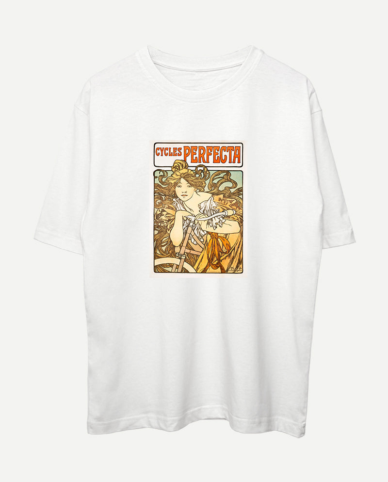 Alphonse Mucha, İngiliz Cycles Perfecta firması için hazırladığı bu afişte, bisiklete binmenin getirdiği özgürlük ve heyecanı ifade ediyor. Kadın figürlerinin ayırt edici özelliklerinden biri olan stilize altın sarısı saçlar afişin tamamını kaplıyor ve kompozisyona hareket duygusu katıyor.