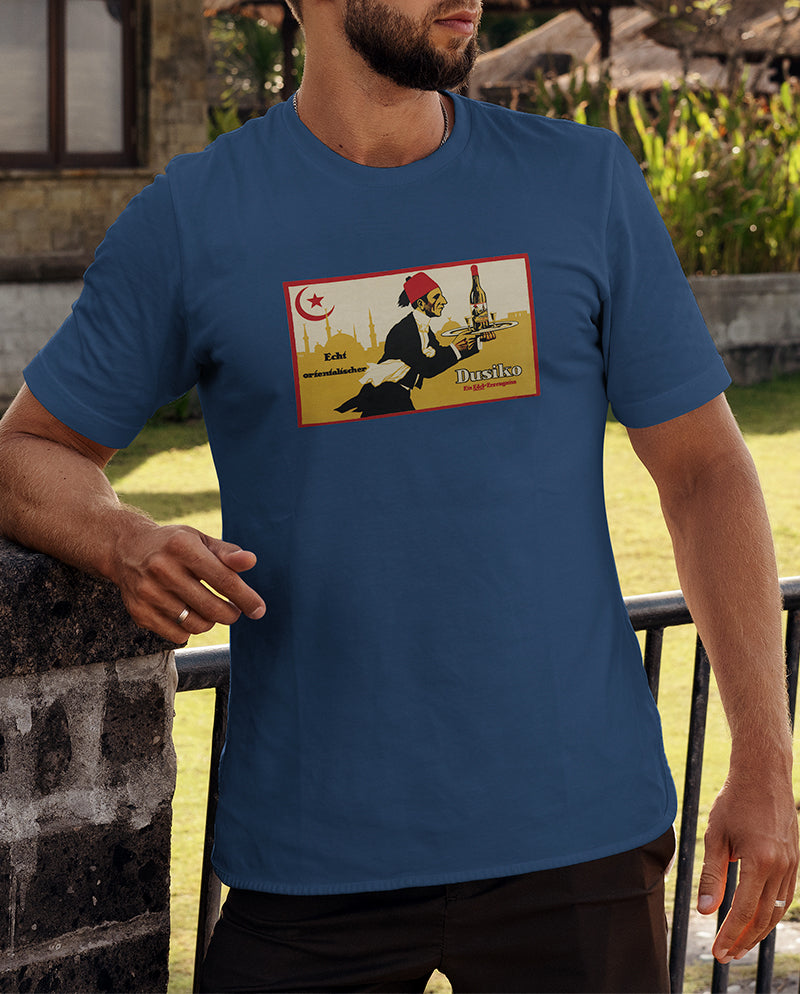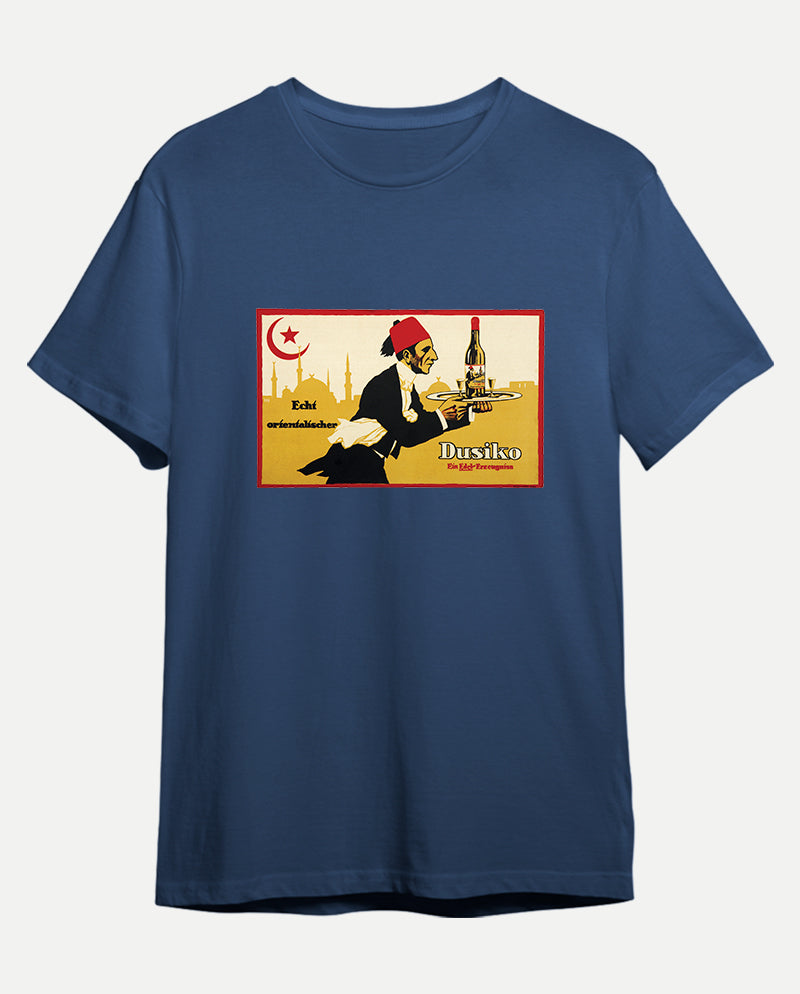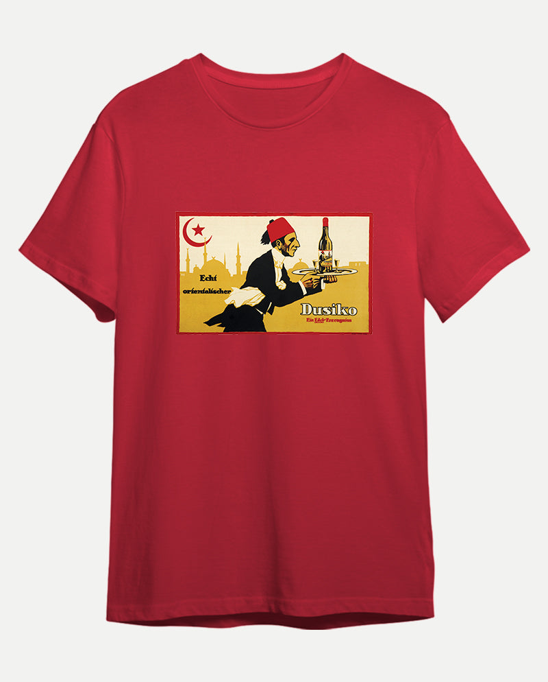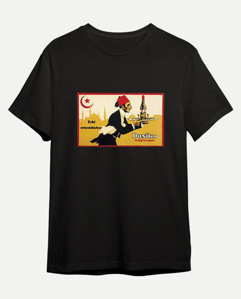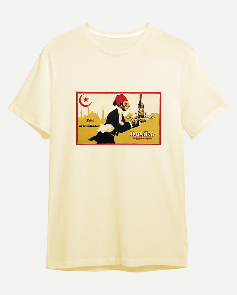 Dusico rakının etiketi, detaylarıyla bir reklam olmaktan ziyade tarihi bir belge. Arka plandaki İstanbul silüeti, fesli uşak ve Almanca “fazlasıyla oryantal” yazısı 1920’lerdeki Türkiye imajının incelikli bir temsili.
