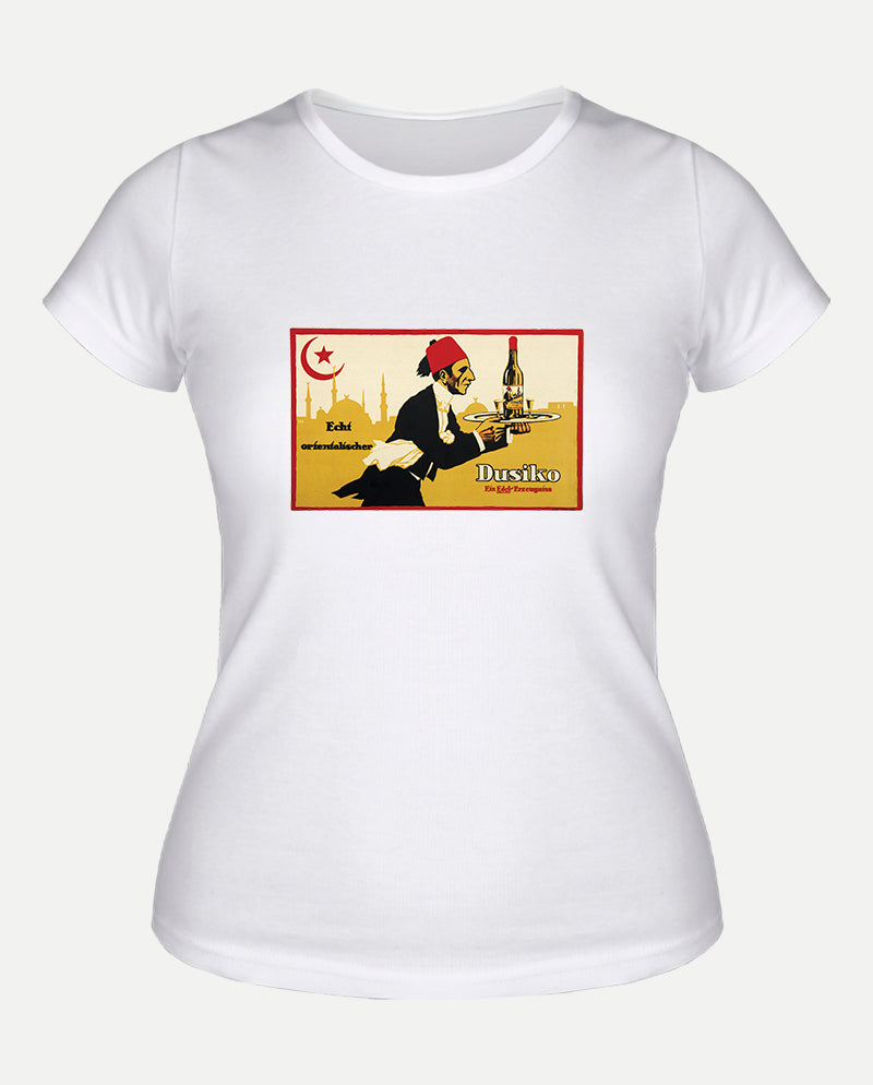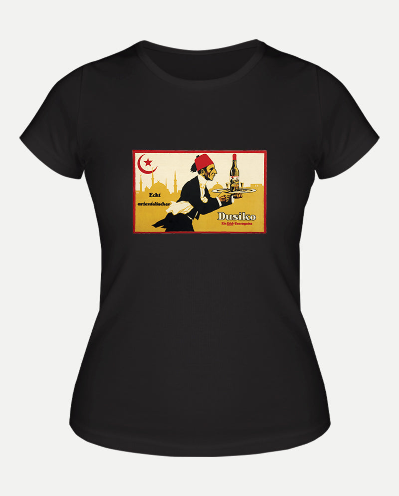 Dusico rakının etiketi, detaylarıyla bir reklam olmaktan ziyade tarihi bir belge. Arka plandaki İstanbul silüeti, fesli uşak ve Almanca “fazlasıyla oryantal” yazısı 1920’lerdeki Türkiye imajının incelikli bir temsili.