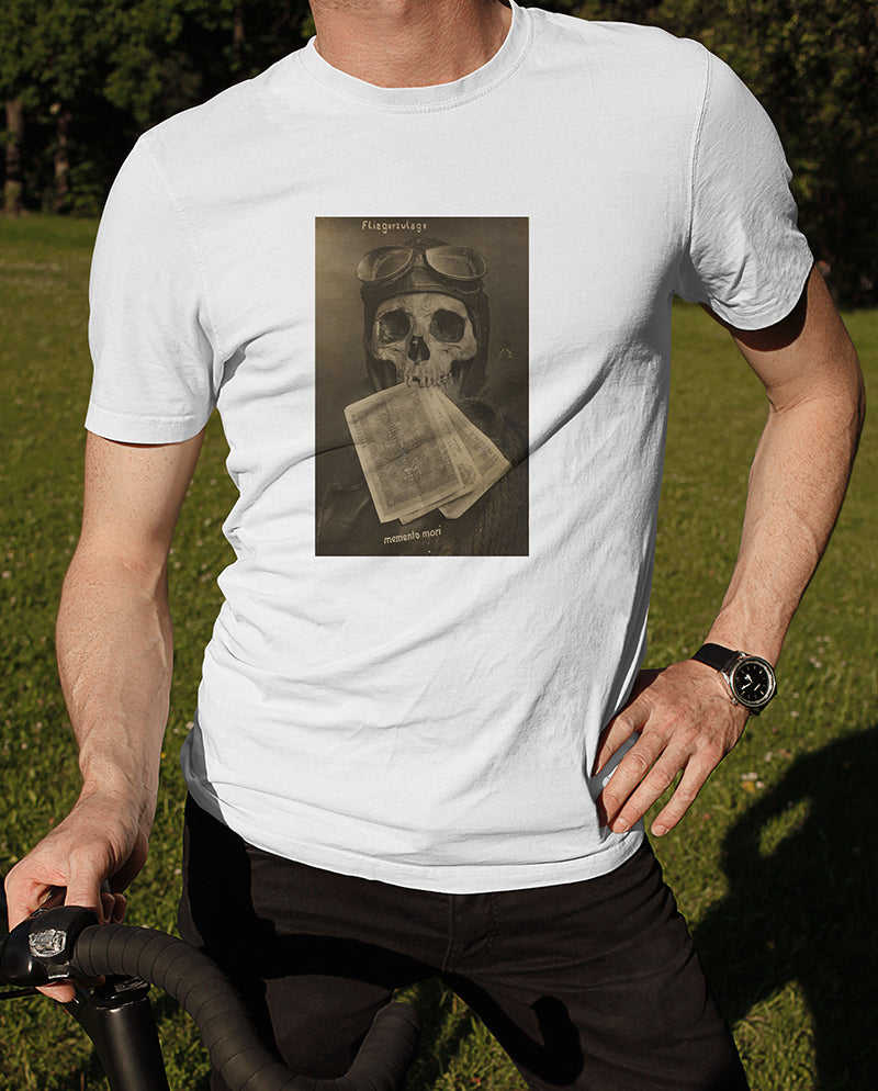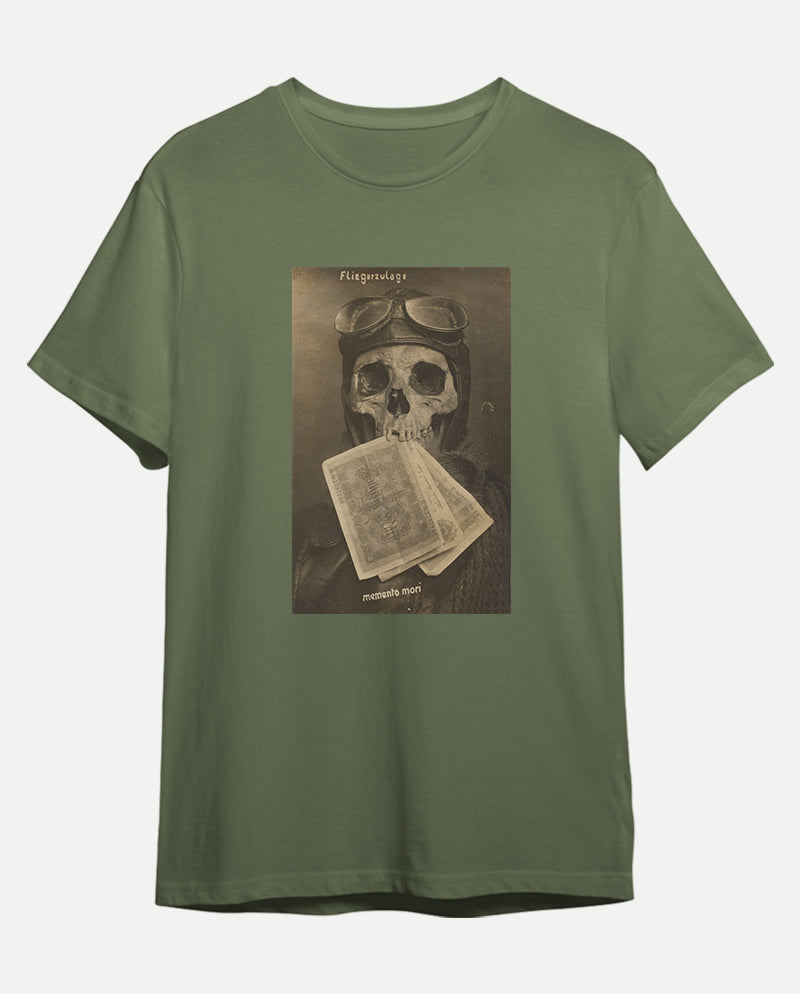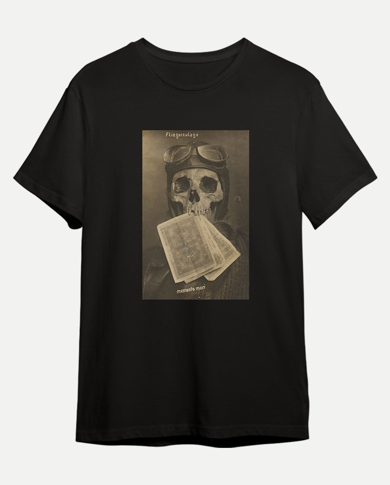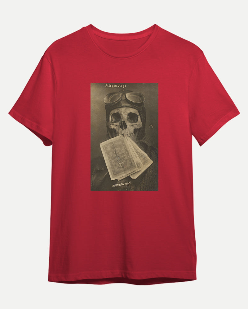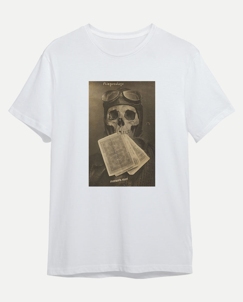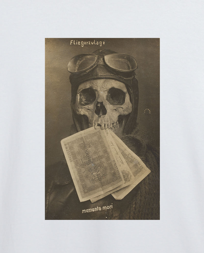 Anonim bir sanatçı tarafından hazırlanan görsel, ağzında üç adet Birinci Dünya Savaşı döneminden kalma, 1914 tarihli Alman 50 mark banknotu tutan, eksik dişli bir pilot kafatasının siyah beyaz resmini içerir.