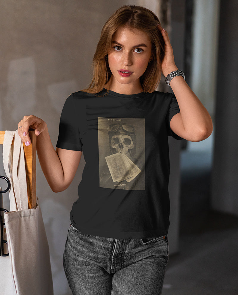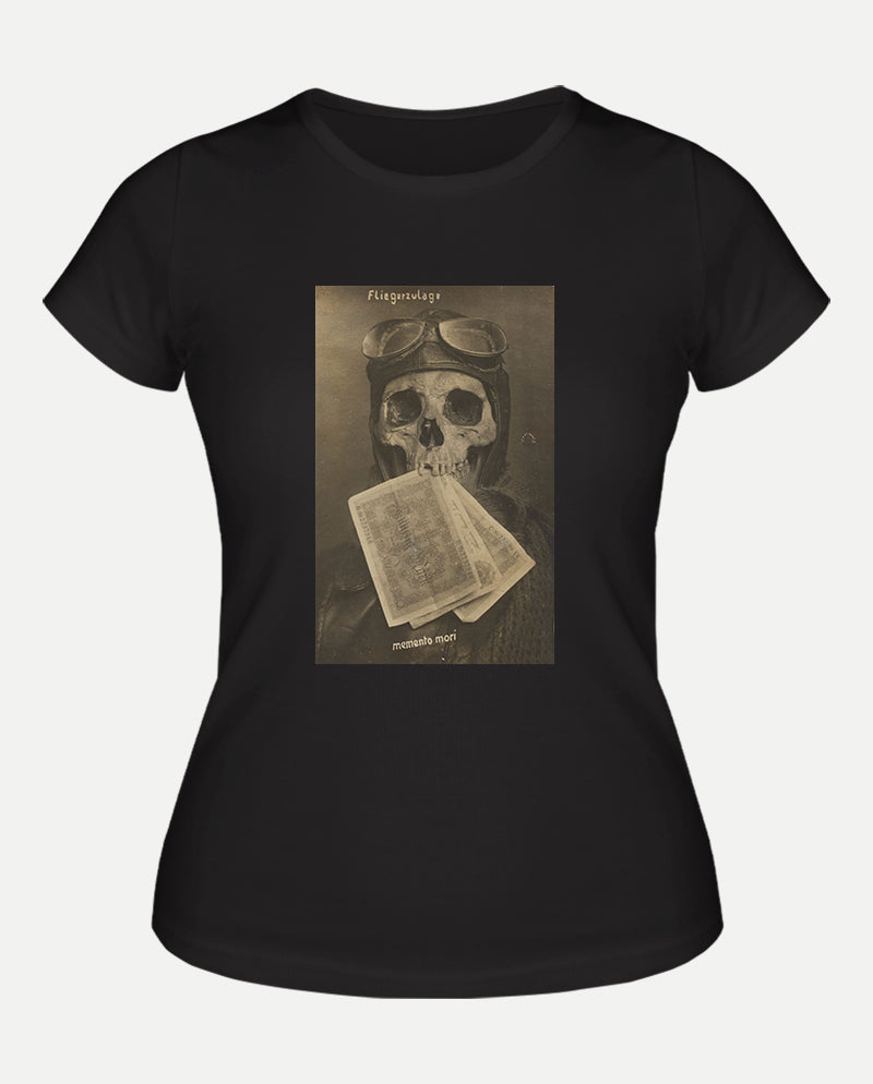 Anonim bir sanatçı tarafından hazırlanan görsel, ağzında üç adet Birinci Dünya Savaşı döneminden kalma, 1914 tarihli Alman 50 mark banknotu tutan, eksik dişli bir pilot kafatasının siyah beyaz resmini içerir.