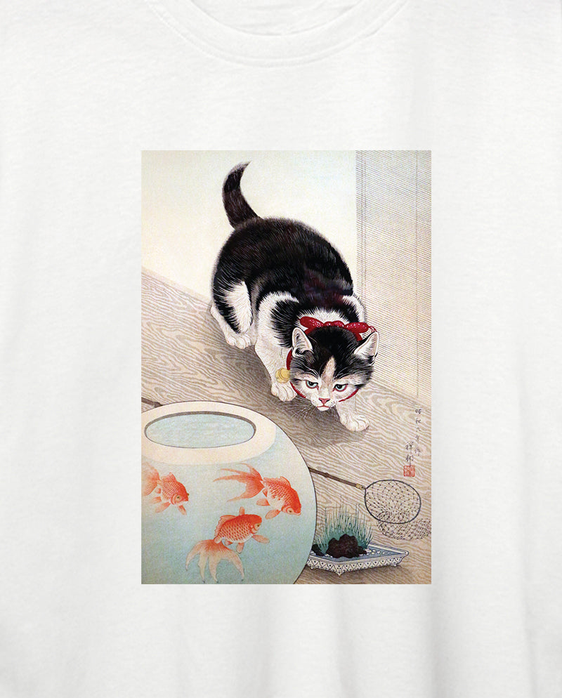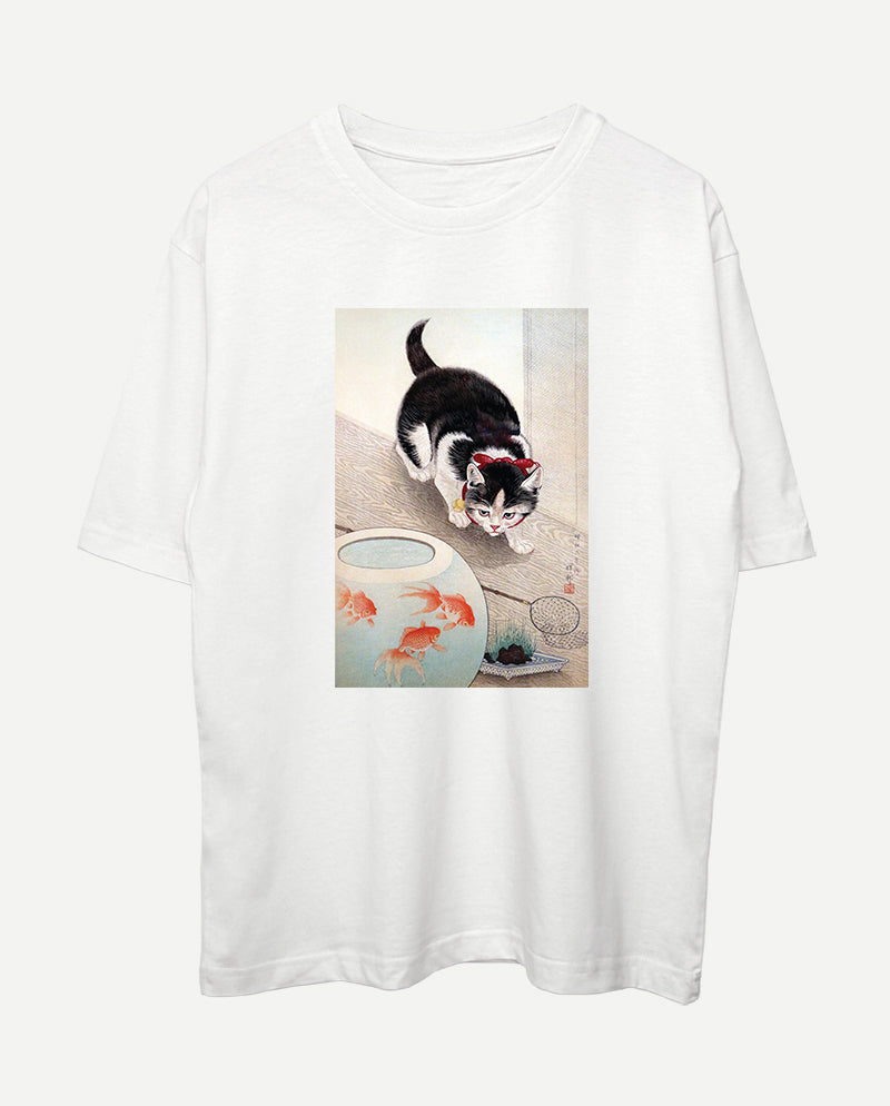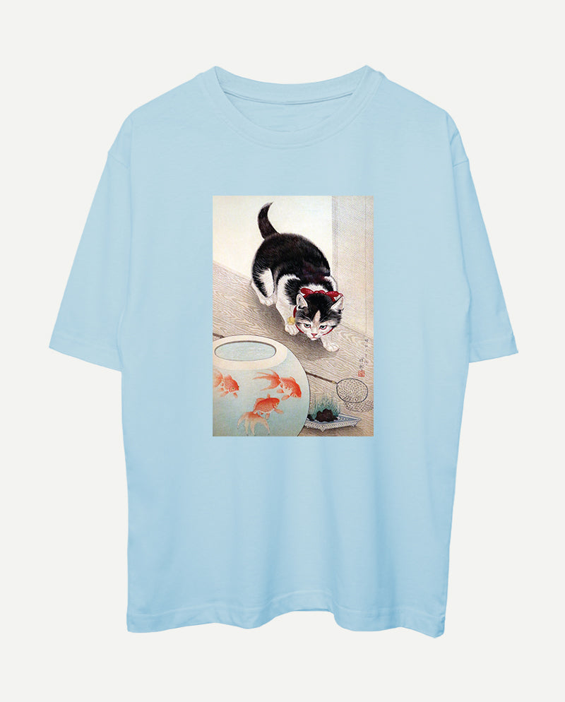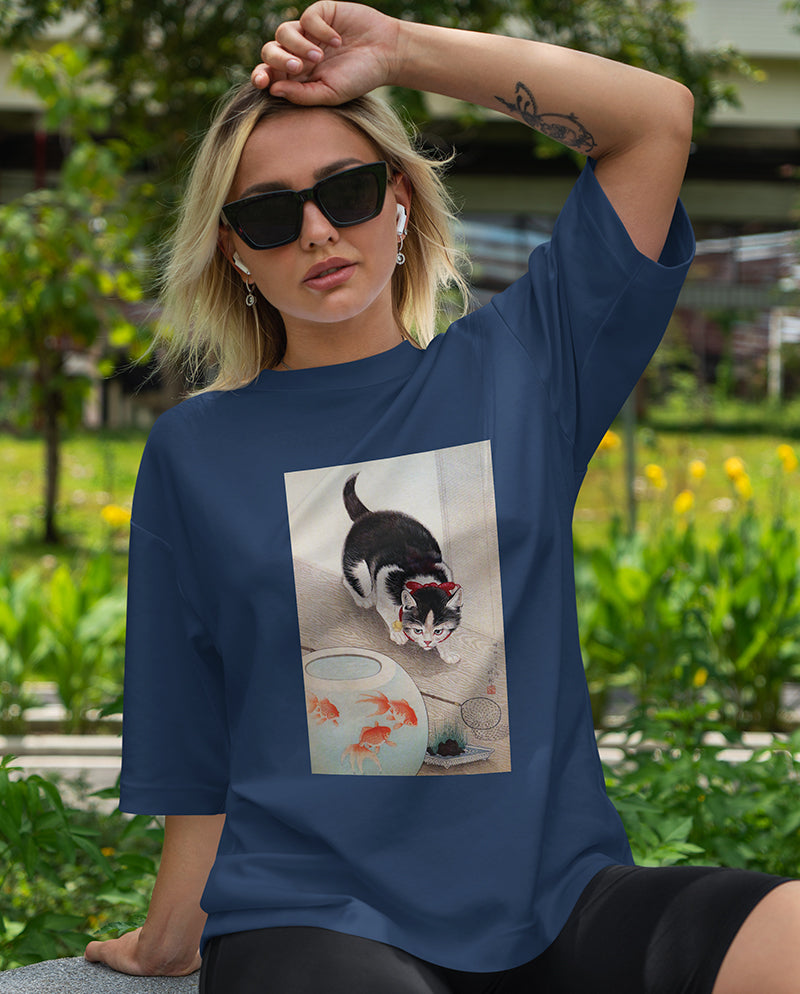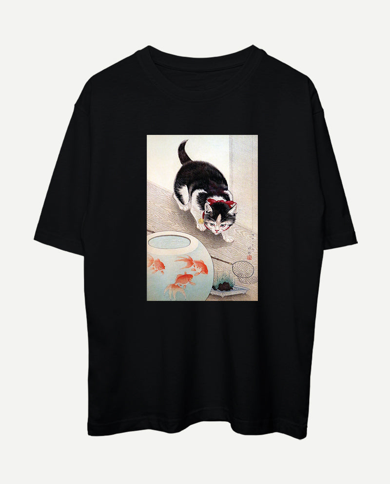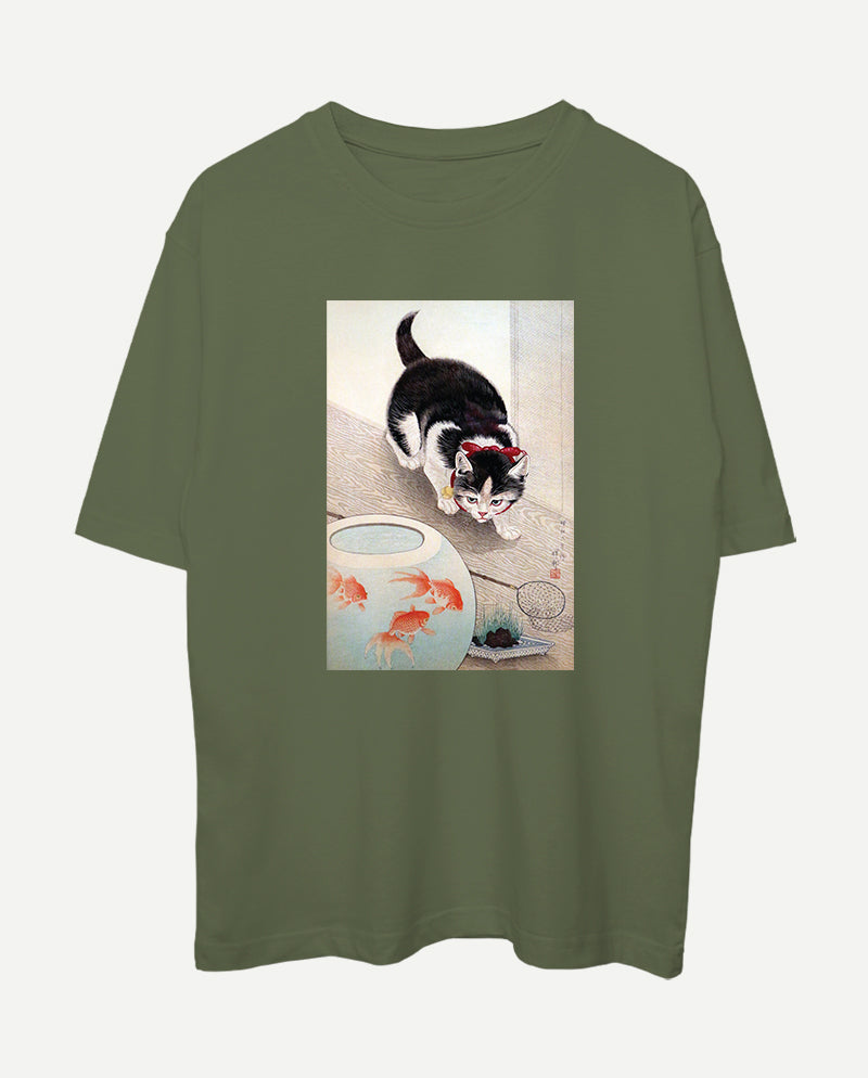 Kedi ve Japon Balığı Kasesi Oversize Tişört