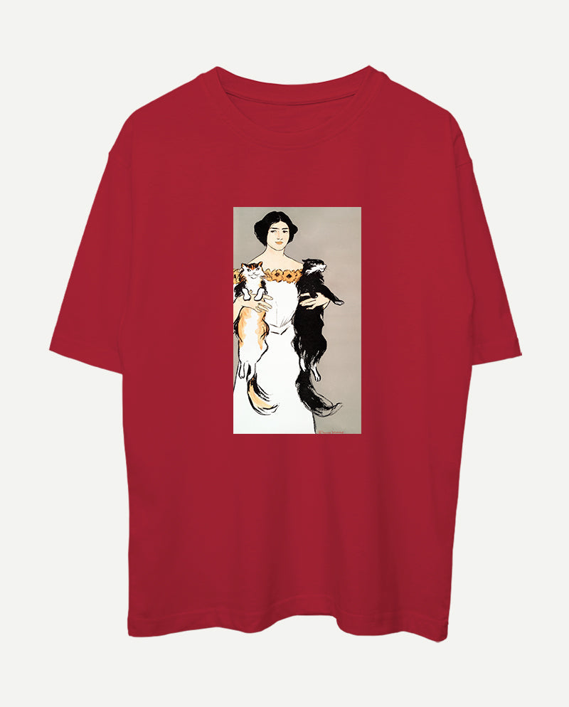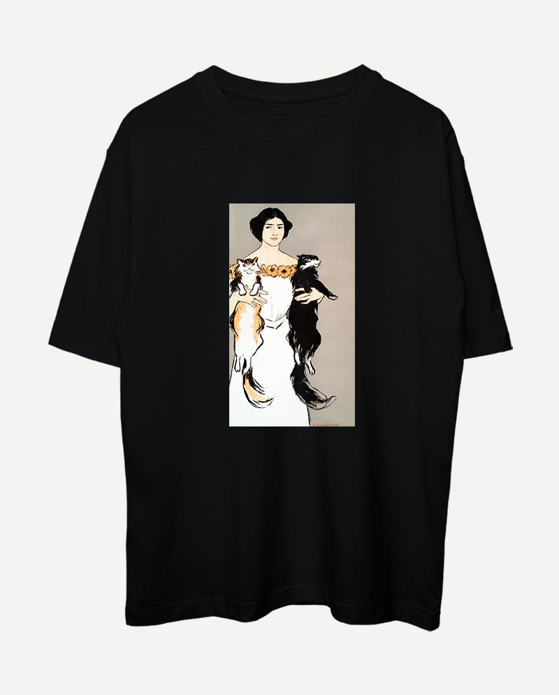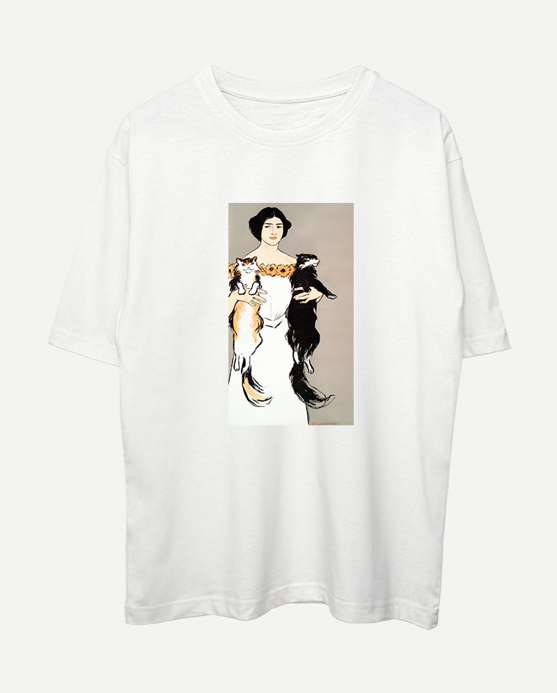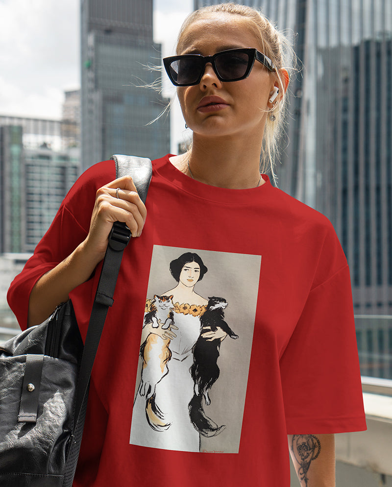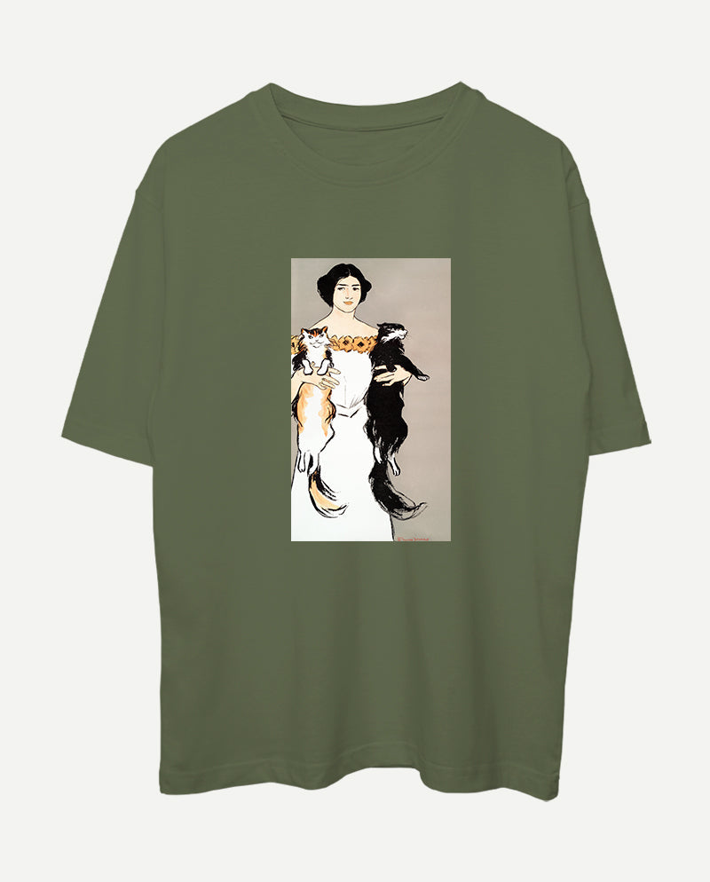 Kedileri Tutan Kadın Oversize Tişört