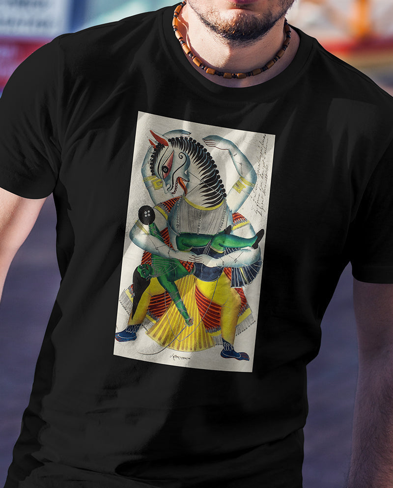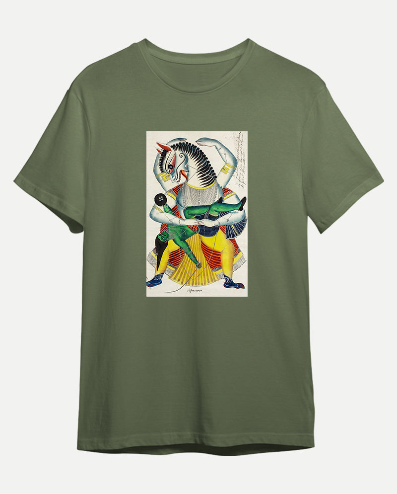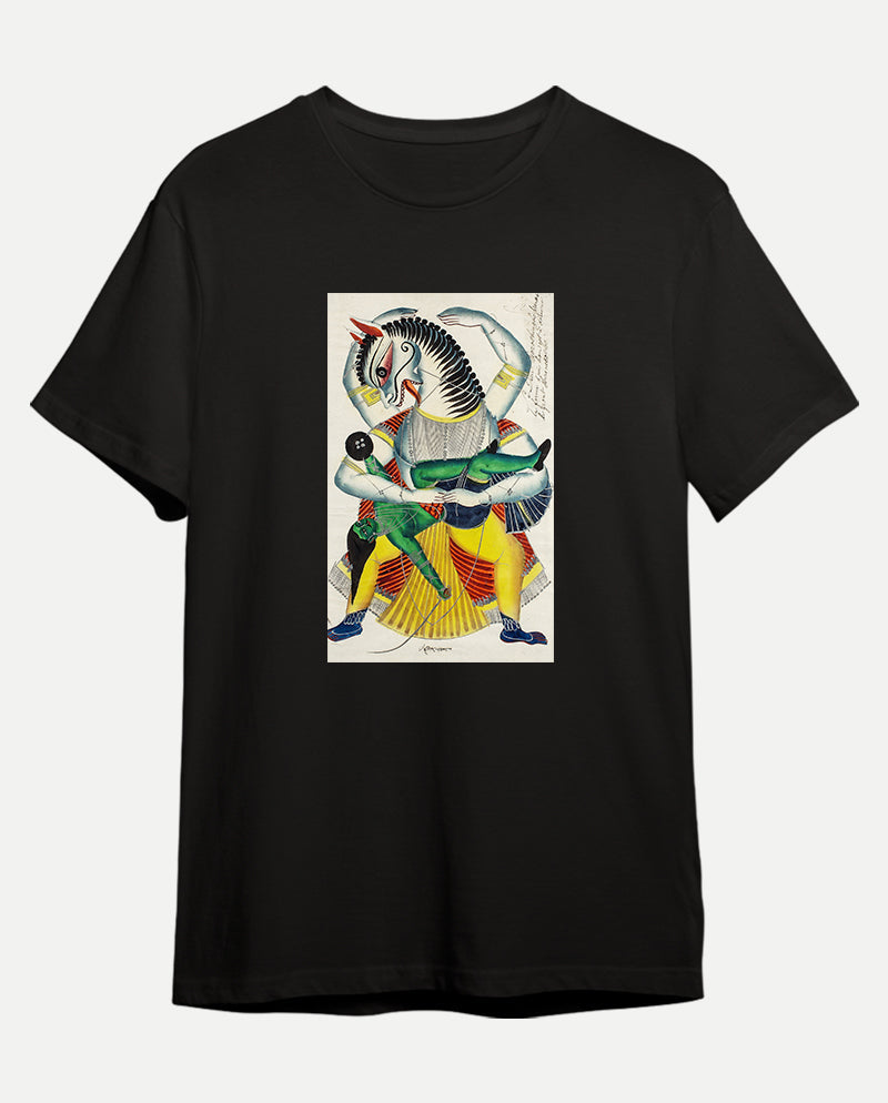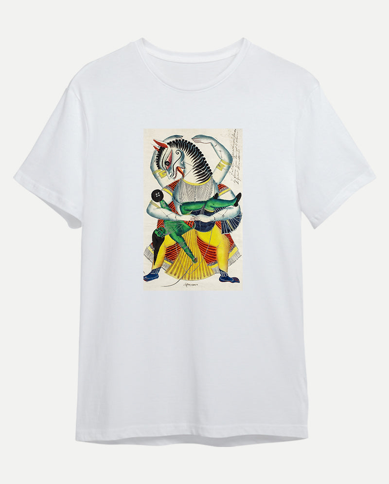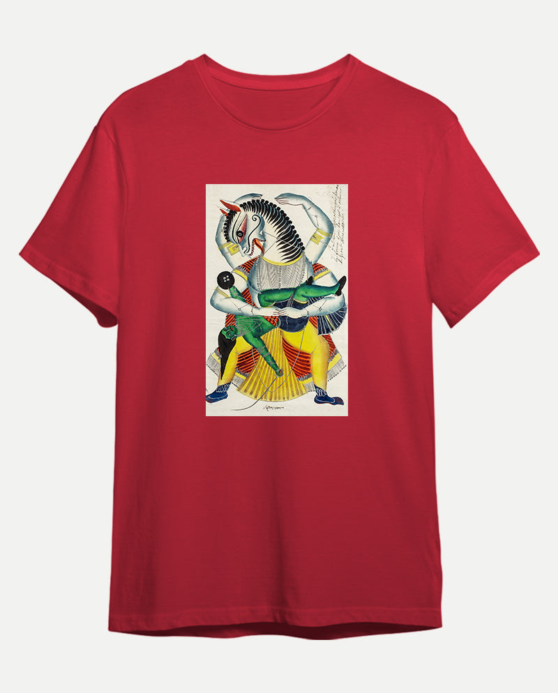 Hindu tanrılarını anlatan bu güçlü suluboya resim, 19. yüzyıl boyunca Hooghly Nehri yakınlarındaki Kalighat'ta bulunan Kali tapınağının çevresine yerleşen, aşağı Bengal'deki parşömen ressamları kastına mensup sanatçıların ürünüdür. Kalighat tapınağı, Hindistan'da Kali'ye adanmış en kutsal dört tapınaktan biridir. Bugünkü haliyle 1809 yılında yeniden inşa edilen tapınak, 19. yüzyılda önemli bir hac merkezi haline gelmiştir.