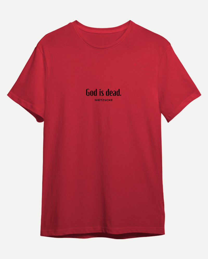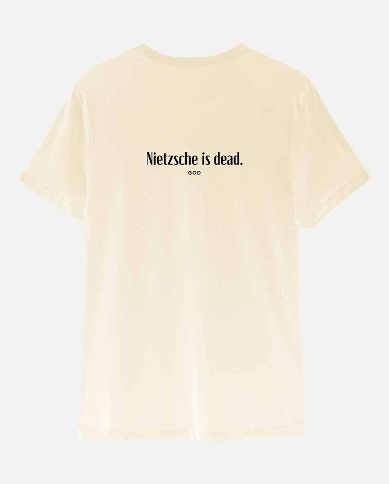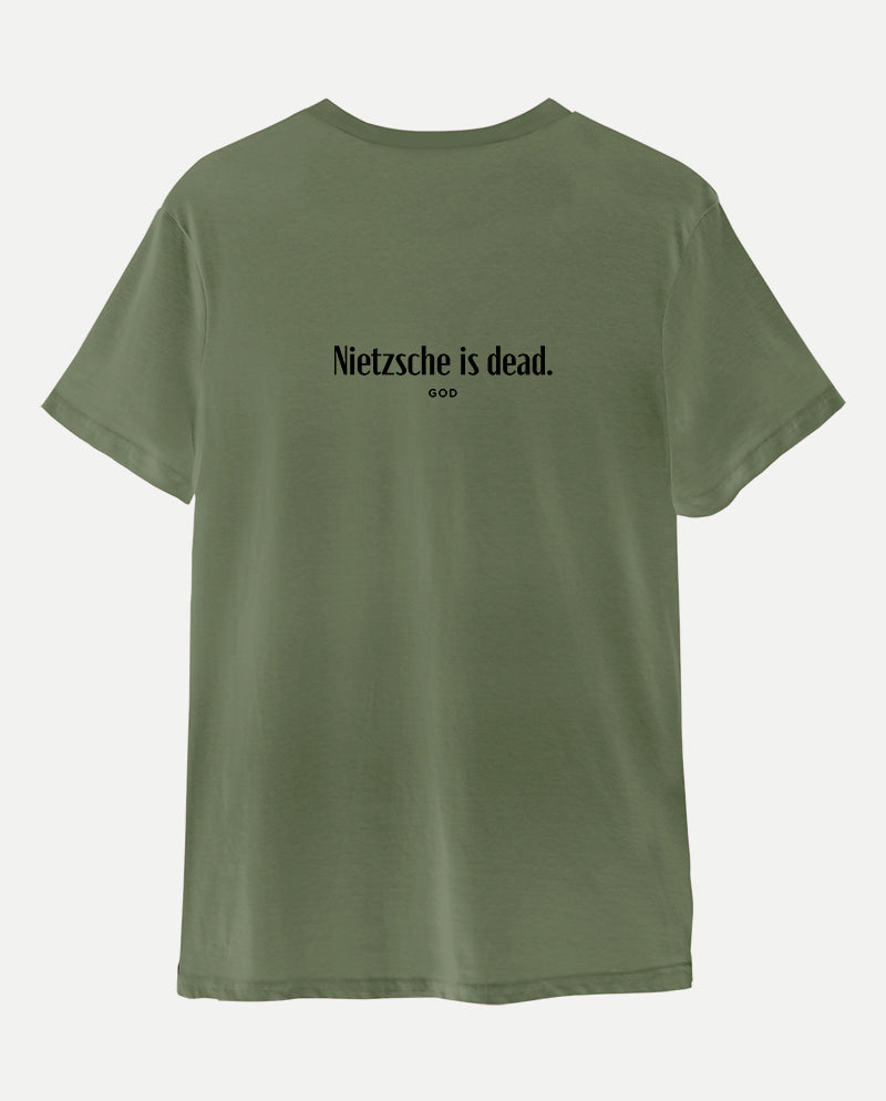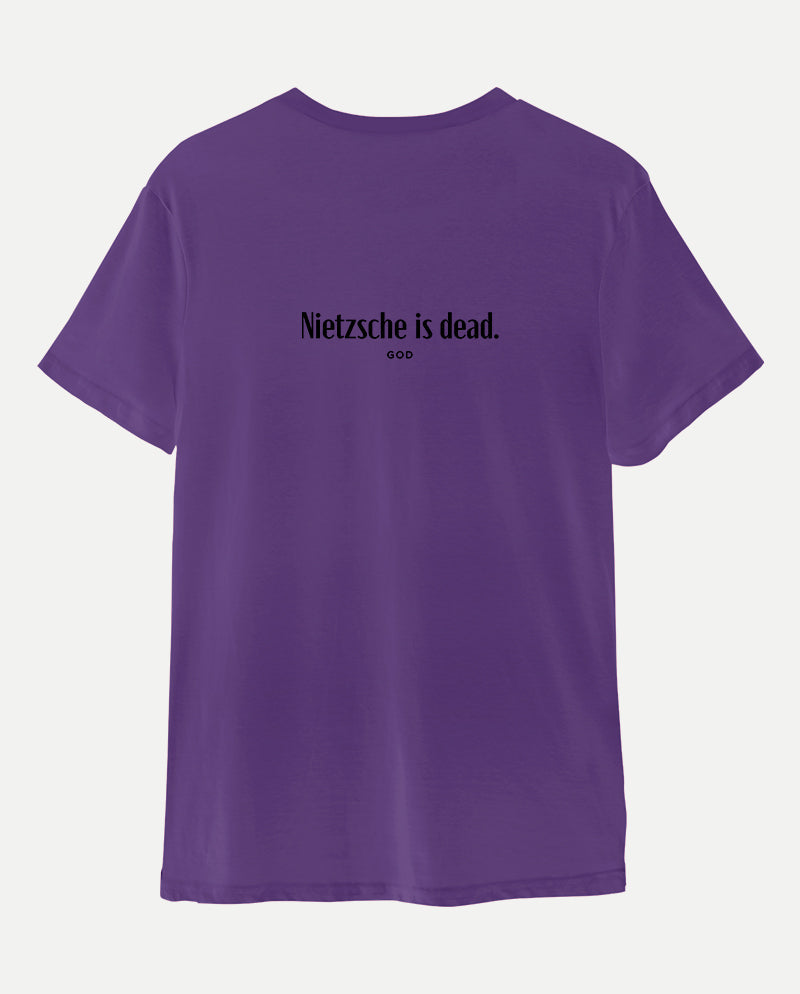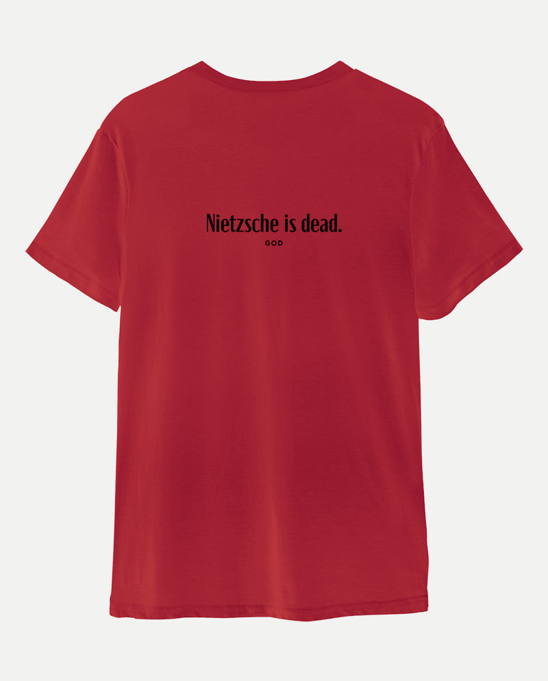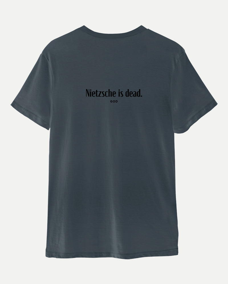 Bizim tişörtün arkasında ise bir ters köşe yatıyor. “Nietzsche öldü” diyen tanrı. Meseleyi bir de karşı taraftan dinlemek lazım…